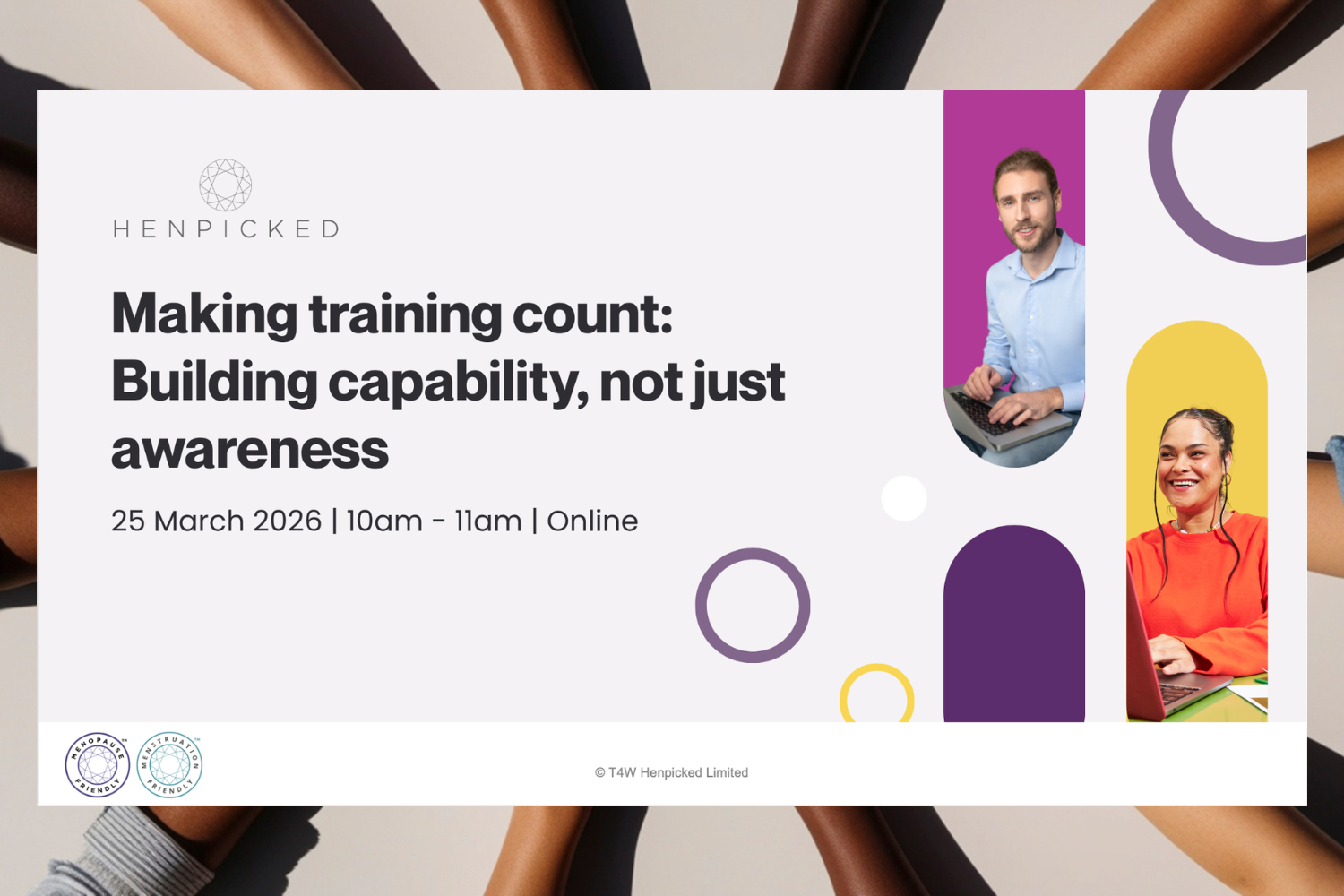 This interactive session, delivered by Henpicked: Menopause in the Workplace with Jo Lee-Morris, Head of Training and qualified coach and learning professional, offers time to reflect, understand and discover strategies for managing our mindset and practicing self care and what this could look like in your organisation so that people can thrive during menopause.